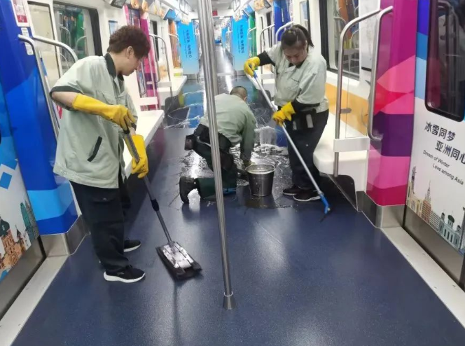 亚冬会期间,哈尔滨地铁物业公司对30座重点车站进行多频次保洁,从站外到站内开启全方位、无死角的环境卫生保障工作,为亚冬盛会提供更加整洁、舒适的绿色出行环境。