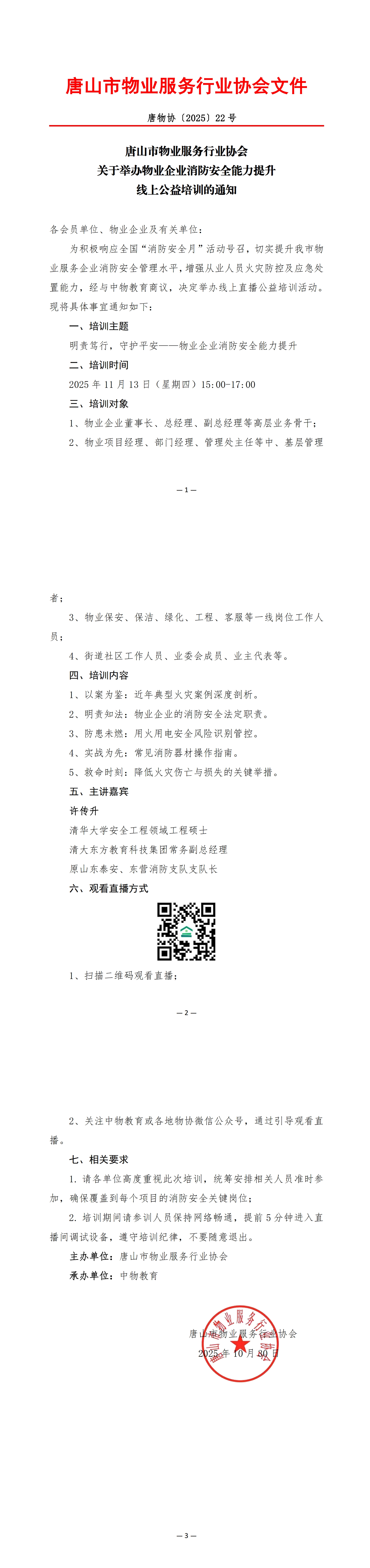 唐山市物业服务行业协会关于举办物业企业消防安全能力提升线上公益培训的通知