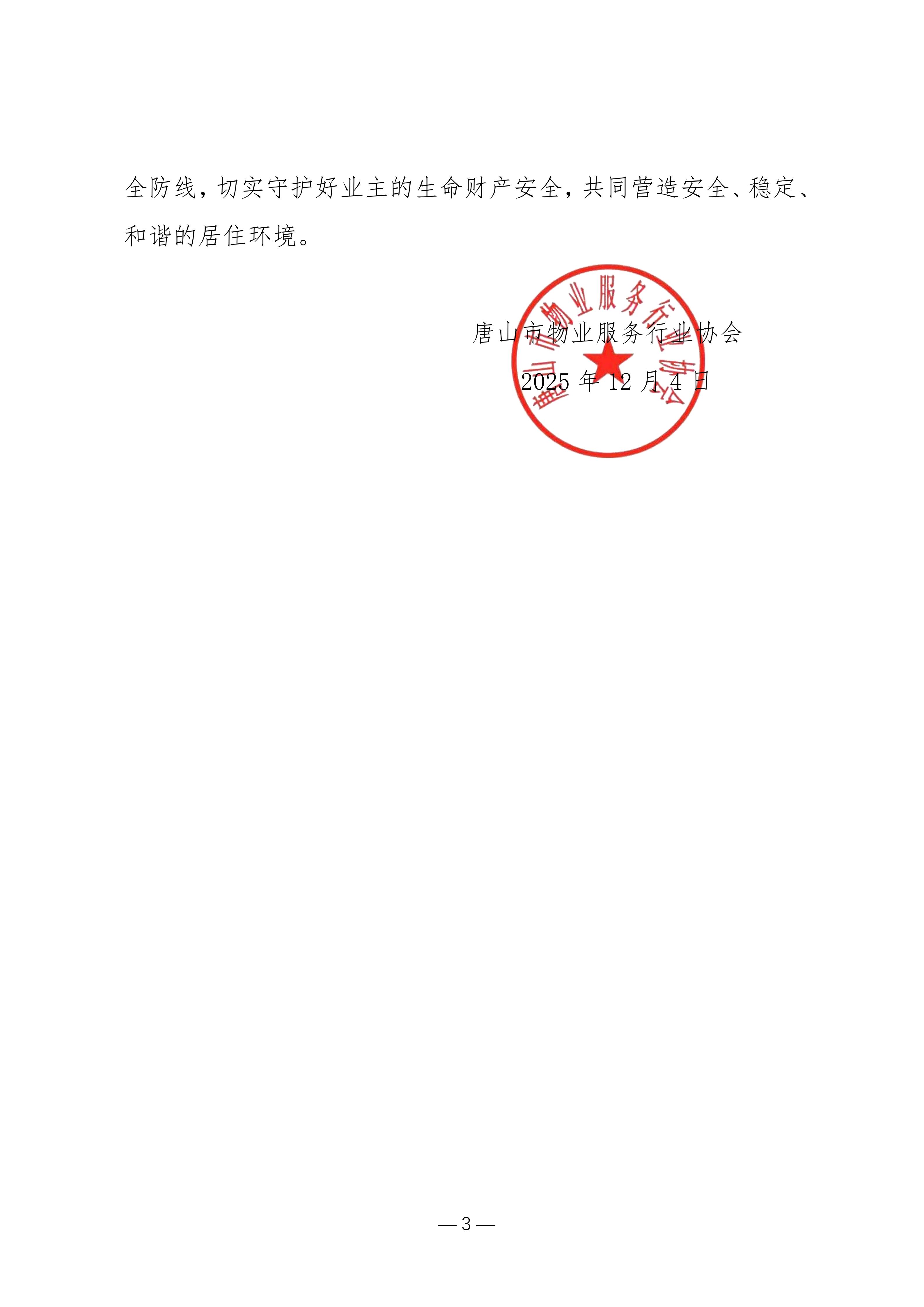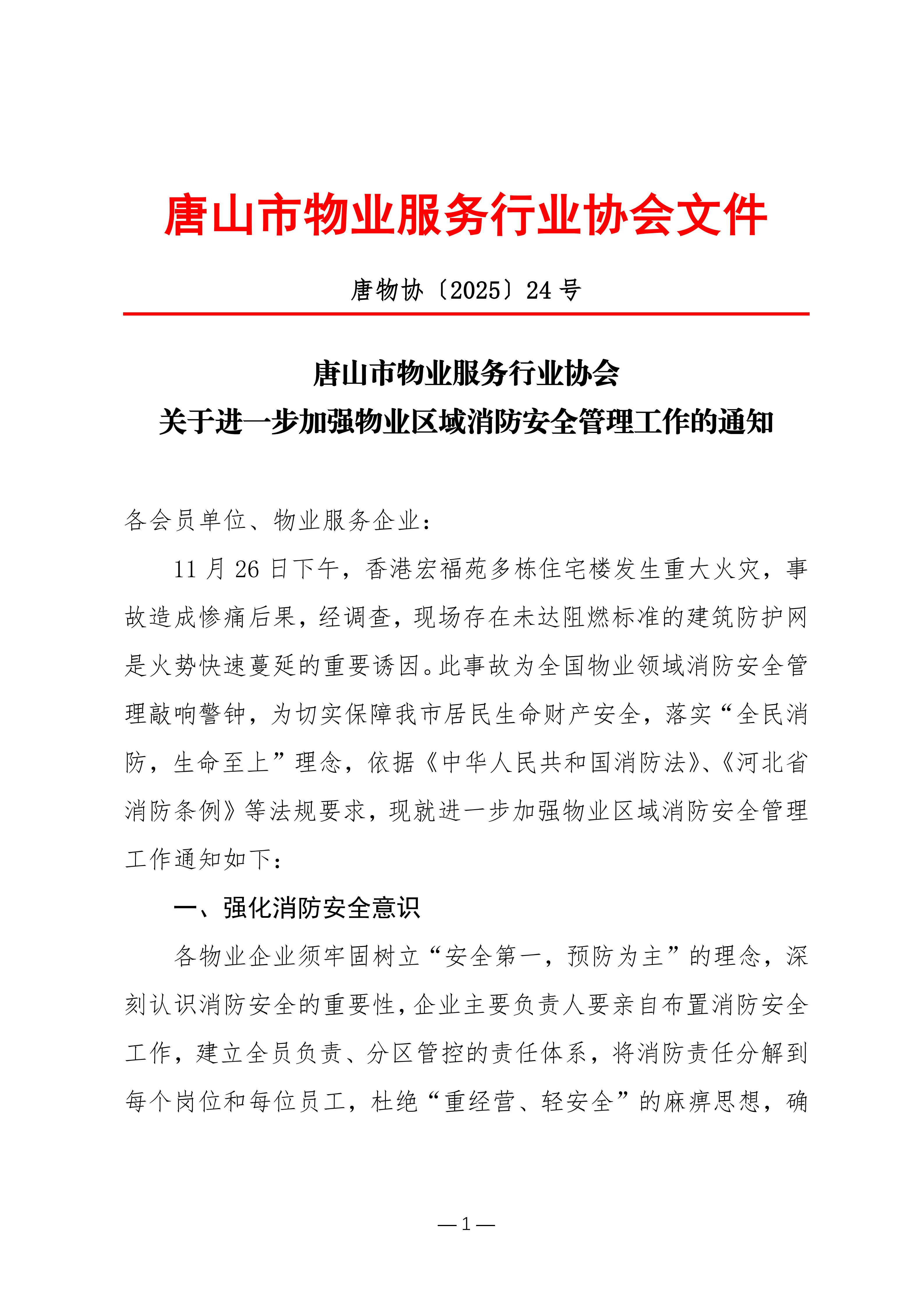 唐山市物业服务行业协会关于进一步加强物业区域消防安全管理工作的通知