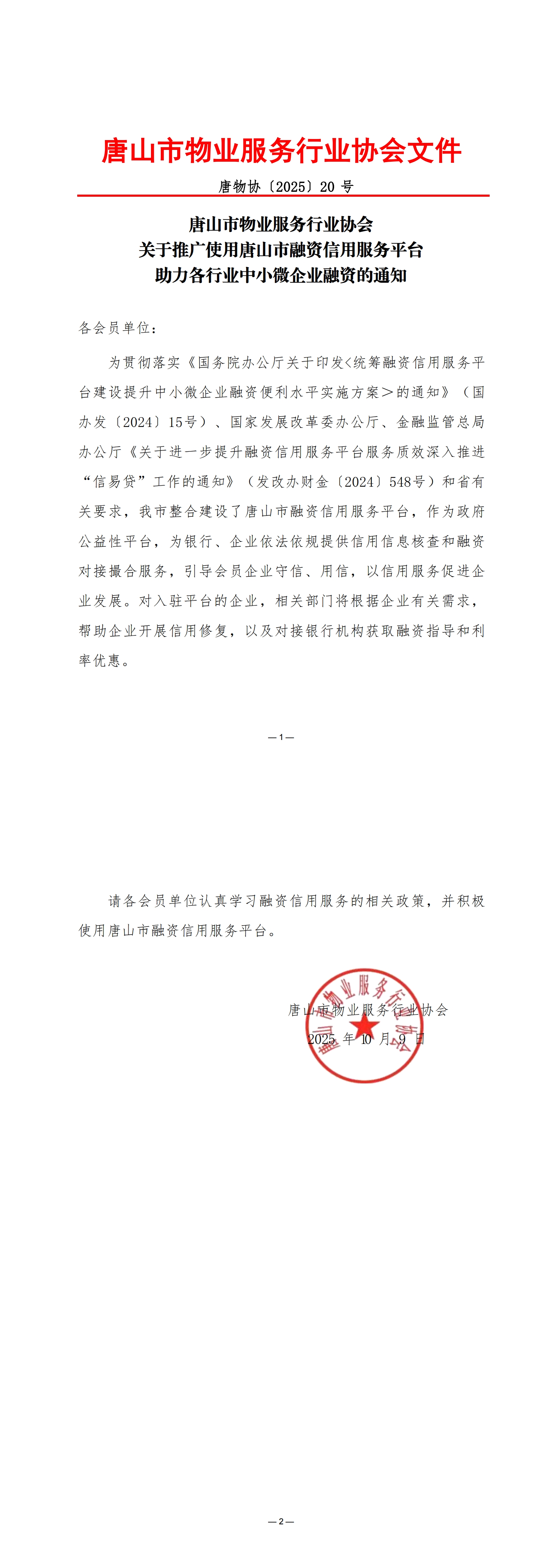 唐山市物业服务行业协会关于推广使用唐山市融资信用服务平台 助力各行业中小微企业融资的通