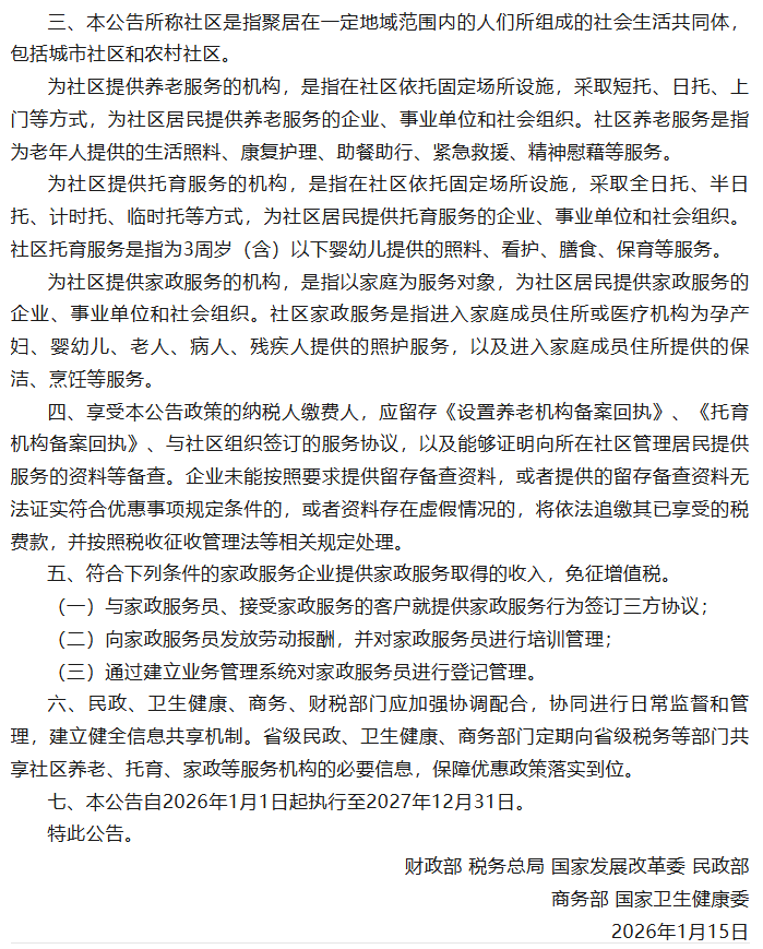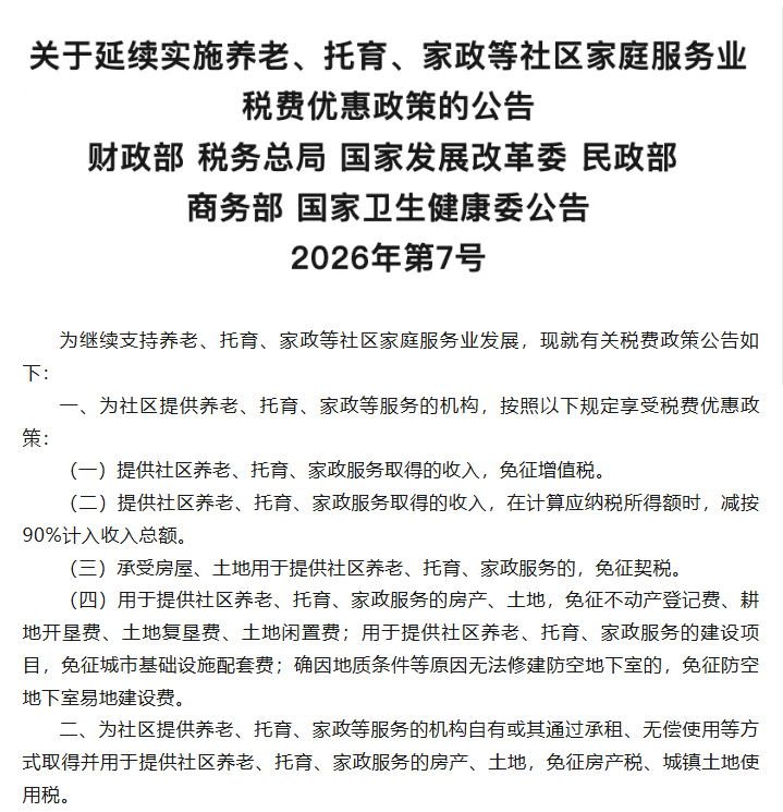 六部门:延续实施养老、托育、家政等社区家庭服务业税费优惠政策