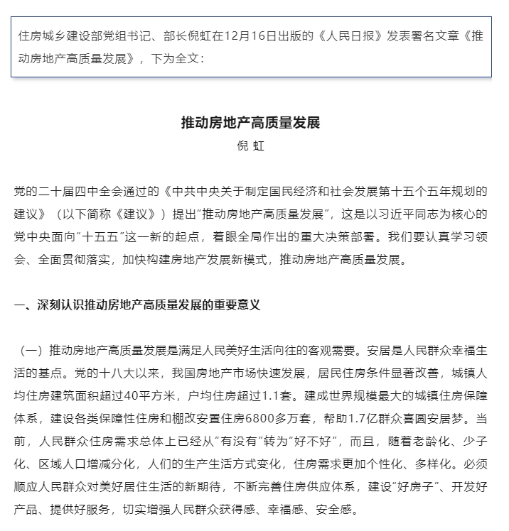 《人民日报》发表倪虹署名文章:推动房地产高质量发展